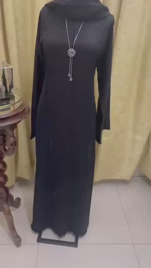 Discover timeless elegance with this exquisite black abaya, beautifully adorned with intricate beaded detailing that creates a stunning visual appeal. This sophisticated piece comes complete with a matching hijab for the perfect coordinated modest look.