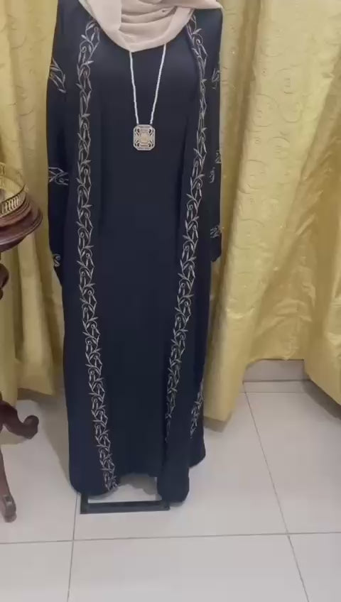 Complete your modest wardrobe with this elegant 3-piece black abaya set, featuring intricate white floral embroidery and a coordinating pink hijab. This sophisticated ensemble offers everything you need for a perfectly coordinated modest look.